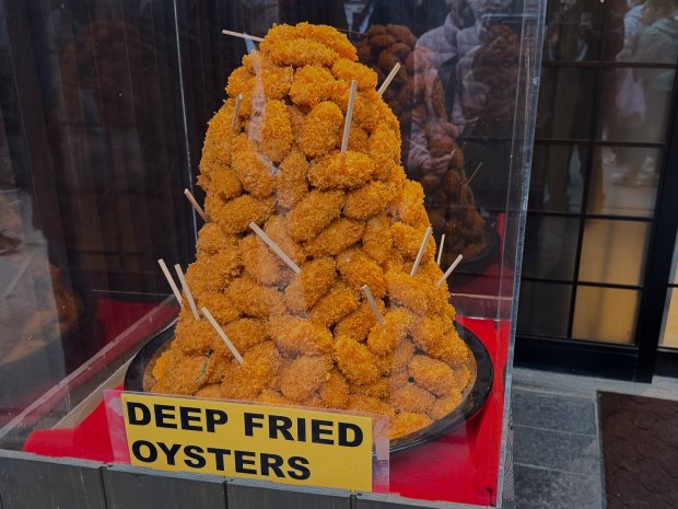 牡蠣と穴子の取材もどこの店でも長蛇の列