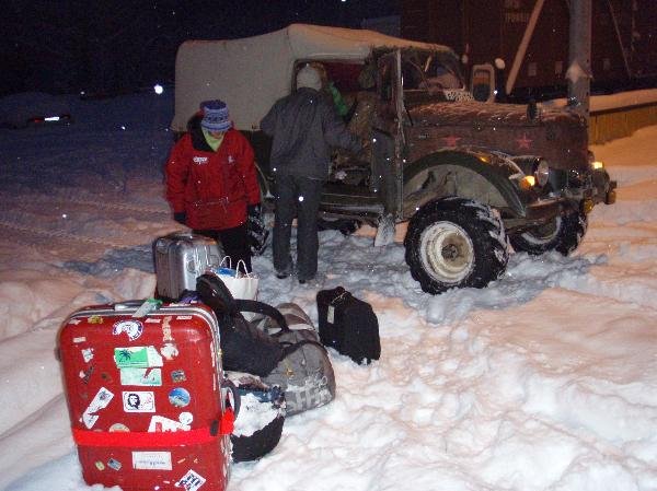 石炭の煙を吐き粉雪が舞い散る夜行列車