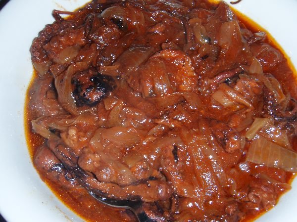 小ダコとたまねぎを赤ワインで煮込んだもの