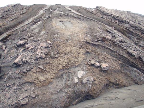 火口から吹きあげられた真っ赤な溶岩は岩肌にいつまでもへばり付いている