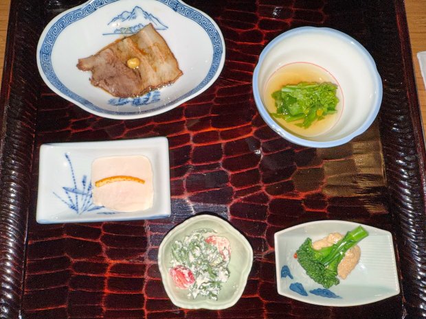 前菜はオリーブポーク・百合根と菜の花のオシタシ・トリハムとみかんの皮・